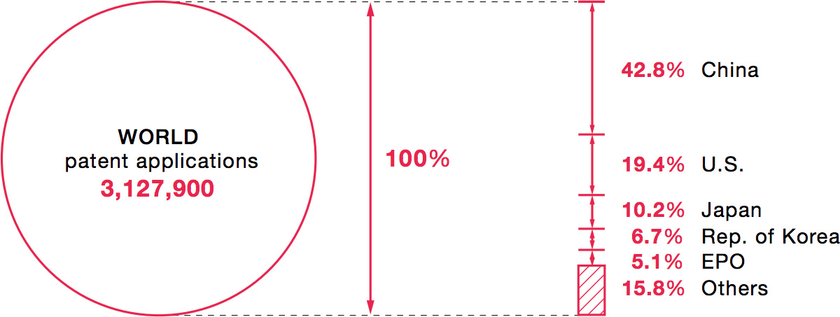 On a Worldwide basis, currently, the total number of patent applications totals approximately 3.1mln, increasing at a 7% CAGR since 2014 (compounded annual growth rate).