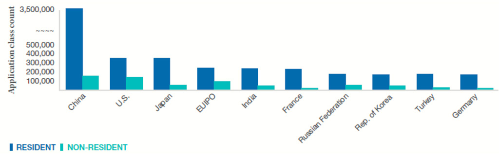 The increase in trademark filing activity significantly shows the high numbers of trademark applications filed in China. The trademark office of China accounts for approximately 75% of the annual increase in global trademark filing activity, followed by Japan’s 9% growth.